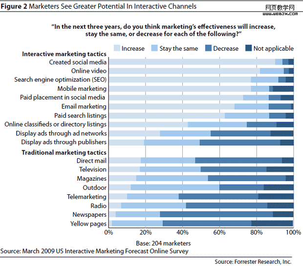 Forrester发布了很好的一个美国互动营销花费报告。有两幅图表很引入注目: