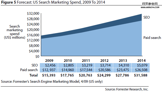 同时,在复合年均增长率方面(CAGR),SEO继续超过竞价排名广告(PPC)。不过两者间的绝对值还是有很大差距,SEO还需要很长时间才能赶上付费搜索广告,但两者的差距在逐步缩小。