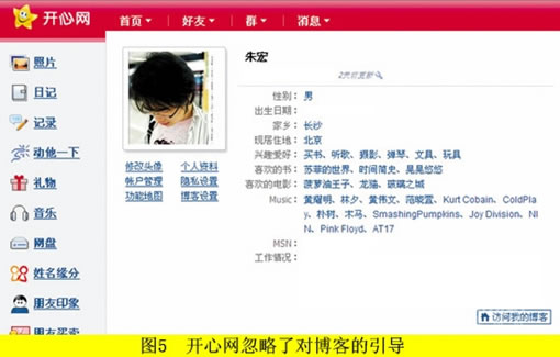 而图5所示的开心网的引导设计就完全不同,忽略了对博客的引导。开心网是一个以娱乐为主线索的网站,虽然它也涵盖有博客的功能,但是这不是它的重点和强项,于是开心网在各种环节上减少对博客的侧重,尽量简化对博客的引导,而重点发展其他有别于传统博客的互动性娱乐项目。