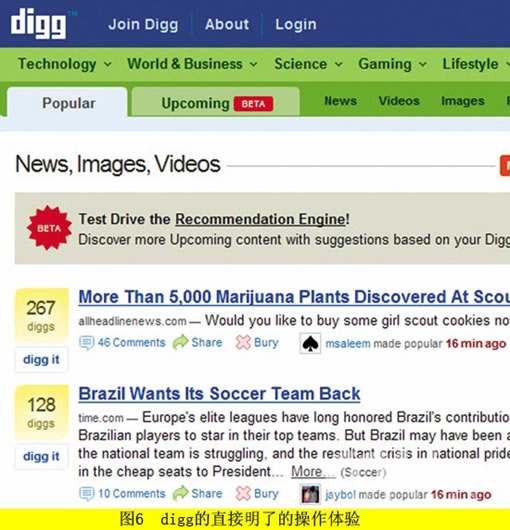 图6所示的digg网站就具有直接明了的操作体验。Digg.com给web2.0带来了新的亮点,每篇文章前有一个digg按钮,用户觉得这篇文章好,就可以顺手“digg”一下,完全不用考虑如何操作。