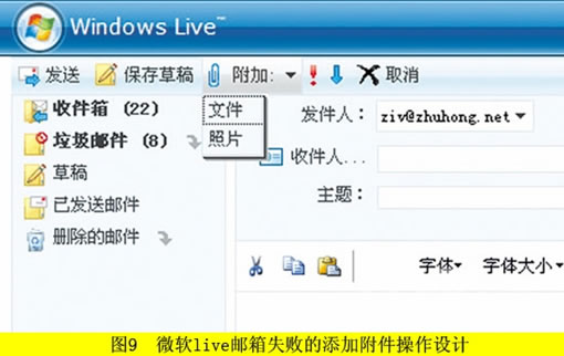 与之形成鲜明对比的是微软的live邮箱,图9是微软live邮箱的添加附件操作,被认为是公认的失败设计。尤其是在编辑邮件状态下,点击曲别针按钮,按理说应该可以浏览机器磁盘,并上传图片或压缩包等有限格式的文件。而在live邮箱里,曲别针按钮右侧有个可下拉的三角形,上传附件须先选择是图片还是文件。我不知道这样设计的意图何在,难道图片就不算是文件的一种吗?
