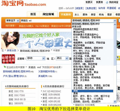 图10是淘宝优秀的下拉选择菜单设计,去淘宝搜索任何一件物品,就可以看到图上这个很长却又很整齐的物品分组下拉菜单,特殊分组还有背景颜色块以示区分。合理的分组搜索能缩小搜索的包围圈,提高用户的寻找效率。