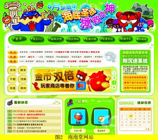 通常情况下,一个页面内尽量不要使用超过4种色彩,太多的色彩容易让人感觉没有方向、没有侧重。当主题色确定好以后,考虑其他配色时,一定要考虑其他配色与主题色的关系,要体现什么样的效果;另外还要考虑哪种因素可能占主要地位,是明度、纯度还是色相。这里我们推荐两个特色突出的网站颜色风格:图1是简洁布局中凸显柔和绿色的网站n词酷,图2是色彩丰富主题突出的典型游戏风格网站泡泡堂。