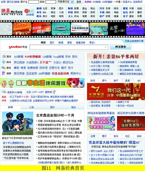 简洁的往往是美的,而美的东西不一定简洁。尤其在网页设计上,对于内容很多的门户网站,任何多余的修饰都会加重浏览者眼睛的负担,所以可以看到门户的设计往往特别简单;而某些专业型网站,就首页来说确实没有什么东西可以展示,那么则需要刻意增加一些点缀而不显得特别空洞。当然,这也不是定理,针对行业不同或者突发性事件,适当地对设计进行调整也能够起到很好的效果。这里我们就举两个门户网站的例子: 图10是奥运版的搜狐首页,门户也设计得美观大方;图11是网易的经典首页,简洁大方堪为业内典范。