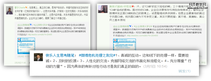 最近微博上@企业微博助理 的账号发起了一个主题讨论#企业应如何面对用户口碑#,参与者众多,包括同行的营销专家,也包括一些企业品牌,甚至微博个人用户,大家各抒己见,谈论在各自的运营经验中对口碑利用的理解。就目前看到的而言,大家关注的更多在于负面口碑的处理。那我们就先谈谈企业在面临微博用户负面口碑时要如何做呢?在对社会化媒体的调查中,数据显示仅有约50%的消费者对企业的评价或投诉会得到回应,而80%收到回应的消费者会继续购买商品。其中还有用户会在购买商品时在社会化媒体中搜索用户对企业的评价。那么企业是否曾体会到了口碑的重要性呢?我们先看看微博上参与讨论的人是怎么说的 :