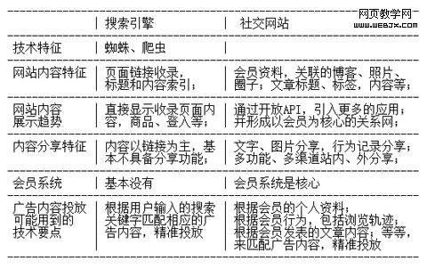 通过参与和分享功能,社交网站把内容和流量提高到一个直接可以和搜索引擎抗衡的高度。下图是社交网站和搜索引擎二类网站的一个简单比较: