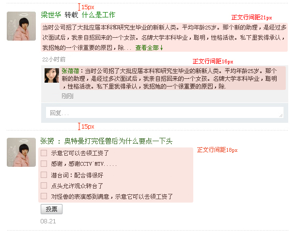 由于大量的信息内容,文字的排版很重要,这里举出一些编排上的细节给予参考(以feed为例)。