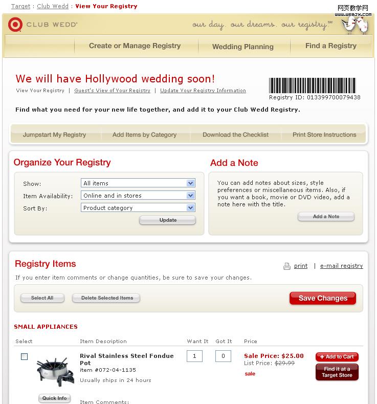下图是Target.com的Club Wedd清单,供将要结婚的会员使用,会员可以定义一个结婚日,包括标题、双方姓名、时间、地点、对大家说的话等。然后将若干产品加入该清单内(Add Items by Category)